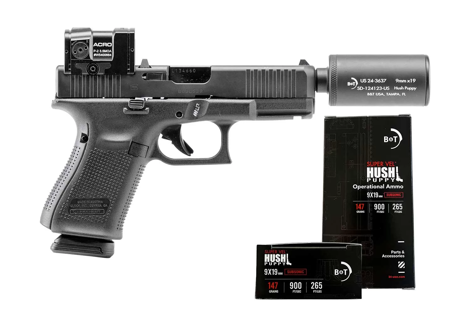 B&T Hush Puppy Glock 19 Gen 5 9mm + Aimpoint ACRO P2 + Suppressor + 2 Boxes